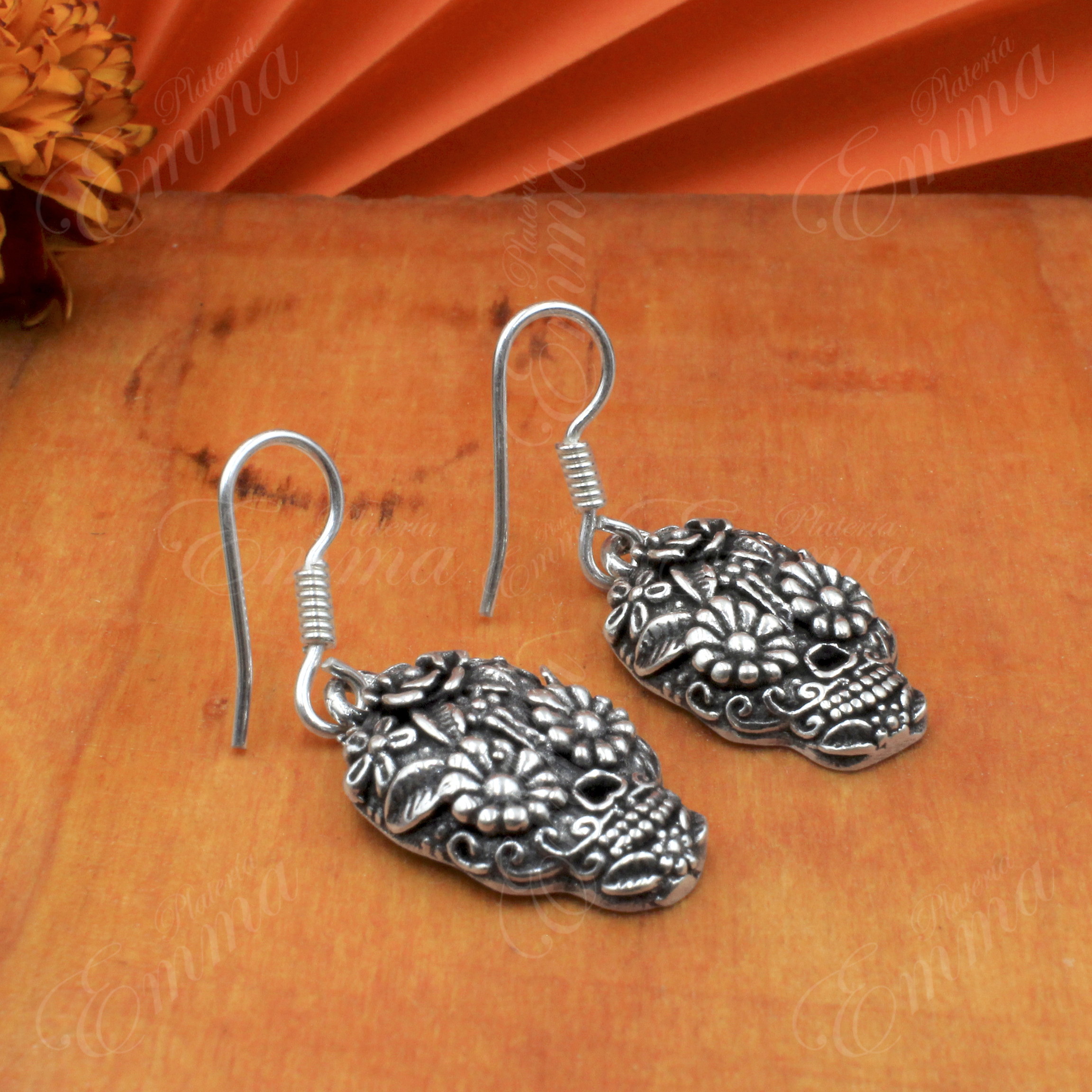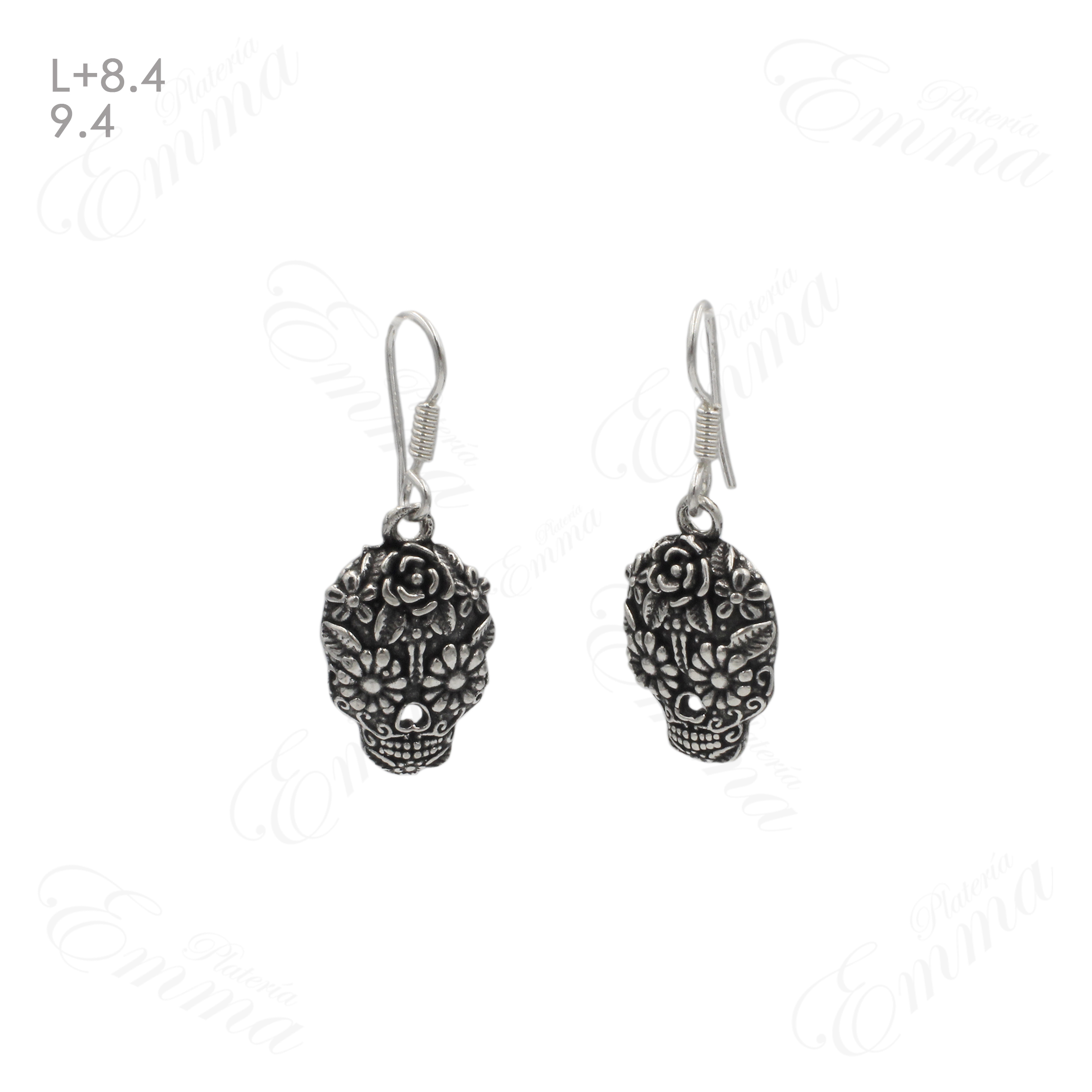 Arete con Arillo Calavera Oxidada Ornamental Flores Plata Ley 0.925