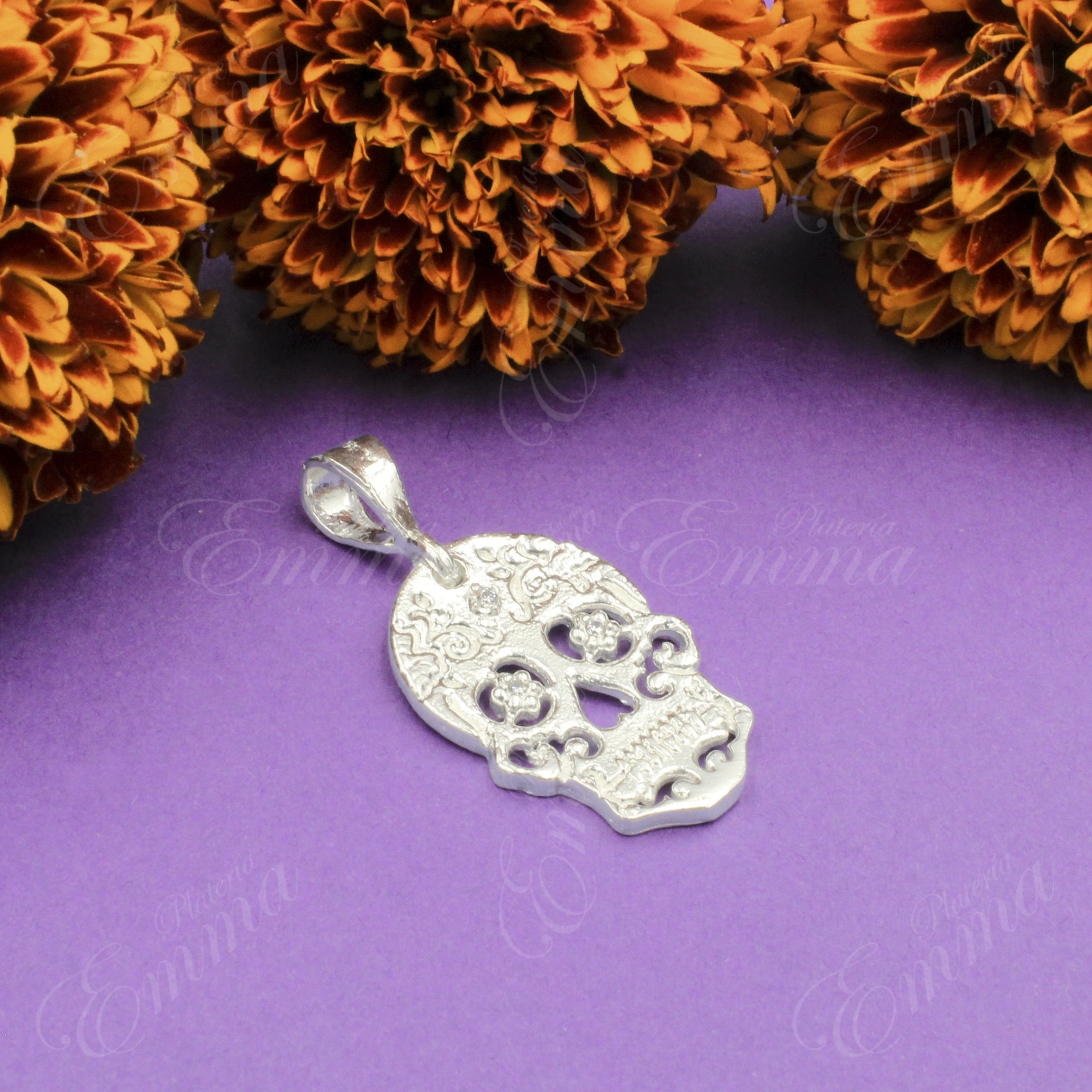 Dije en plata ley .925 con diseño de calavera calada y adornada con ornamentos, elaborado con la técnica de cera perdida. Un trabajo detallado que resalta la belleza y simbolismo del Día de Muertos.