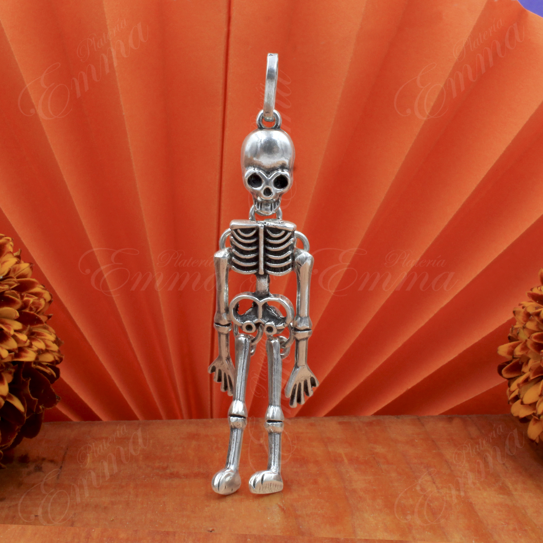 Dije en forma de esqueleto movible, fabricado en plata ley .925 con la técnica de cera perdida. Sus articulaciones móviles le dan un toque único y divertido, perfecto para celebrar la tradición y estilo de esta temporada especial.